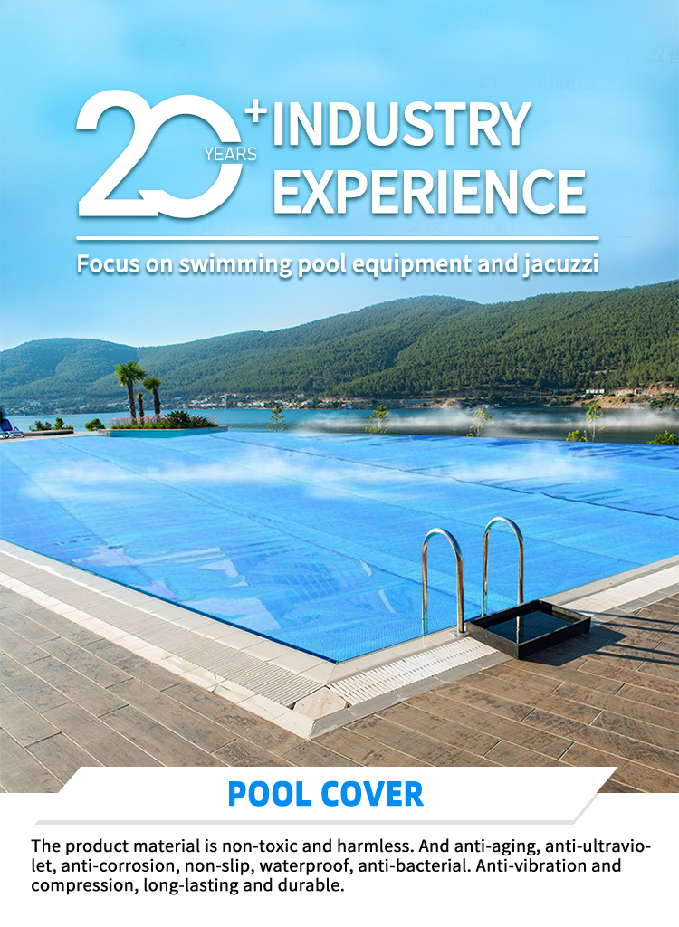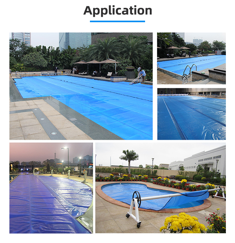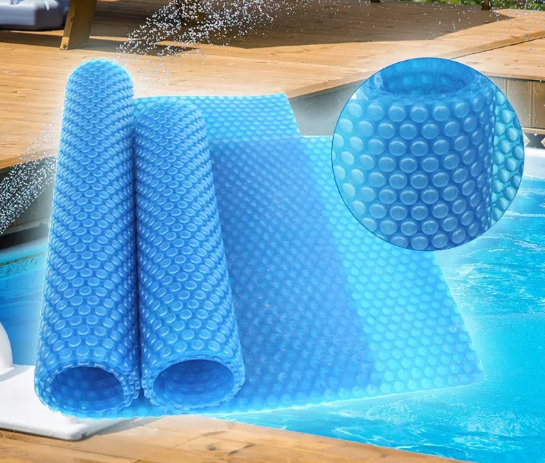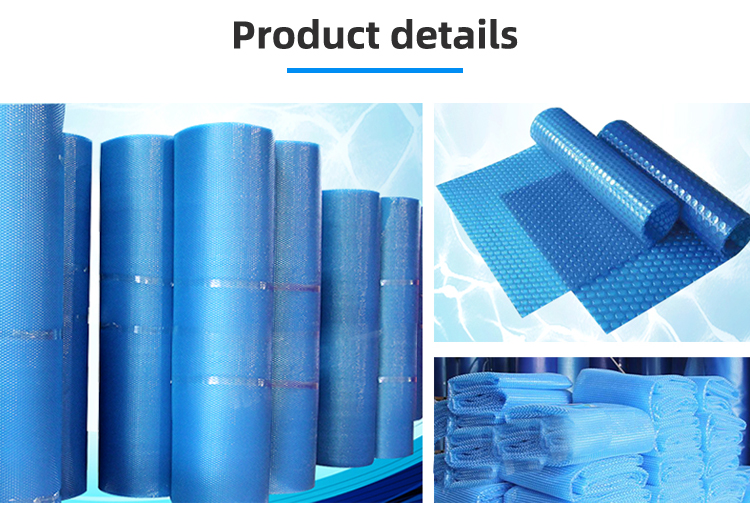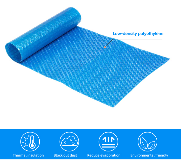 The blue bubble plastic cover is designed to save water loss, reduce evaporation by up to 97%, conserve energy by warming the pool water using solar heating, and keep the pool clean from debris like leaves and dirt.