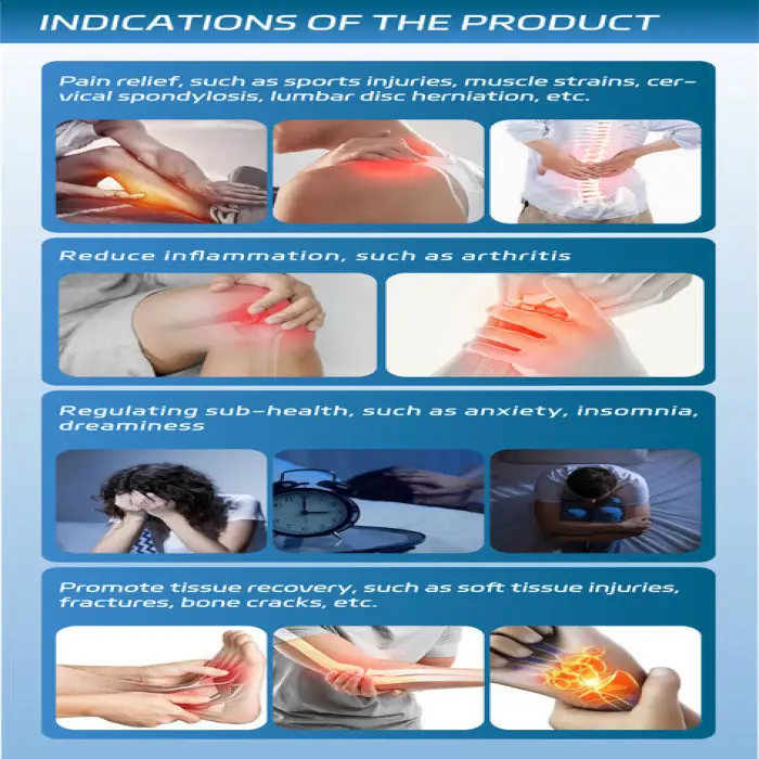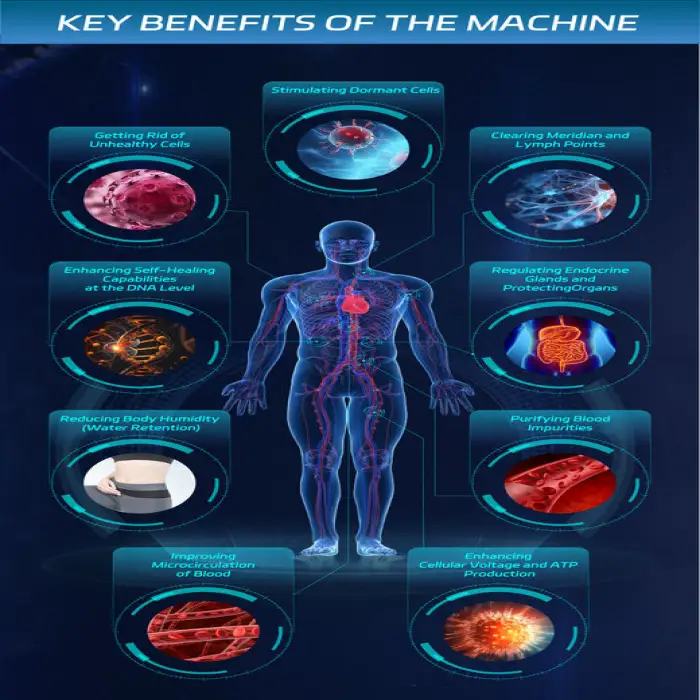 The device utilizes quantum energy and EMF therapy to alleviate pain, enhance skin health, and promote relaxation and blood circulation.