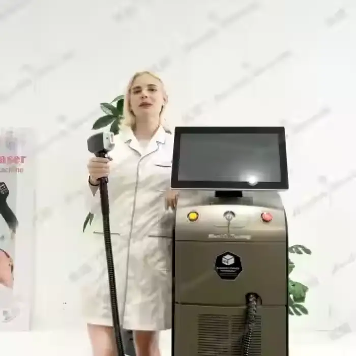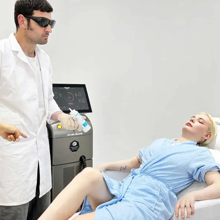 The machine utilizes three wavelengths: 755nm, 808nm, and 1064nm, allowing for versatile hair removal suitable for all skin types.