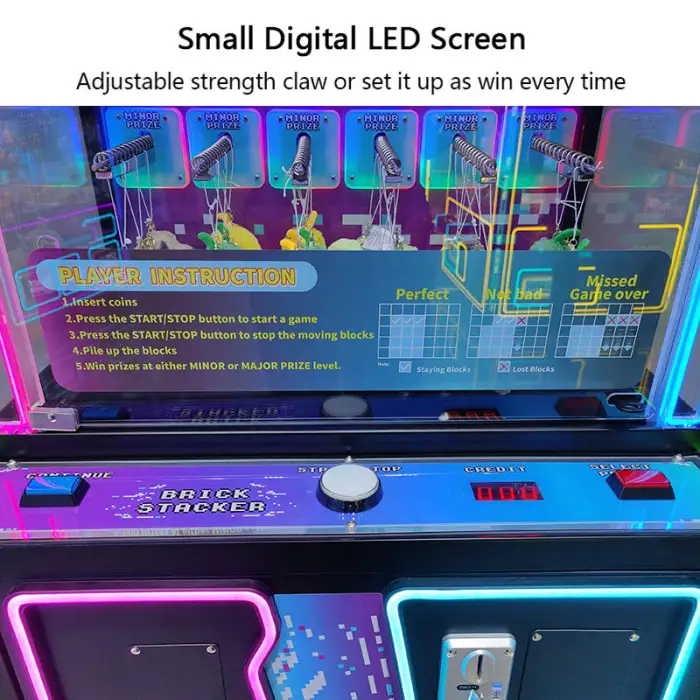 Players must skillfully maneuver the controls to stack bricks accurately and successfully win prizes, enhancing competition and engagement.