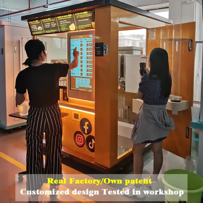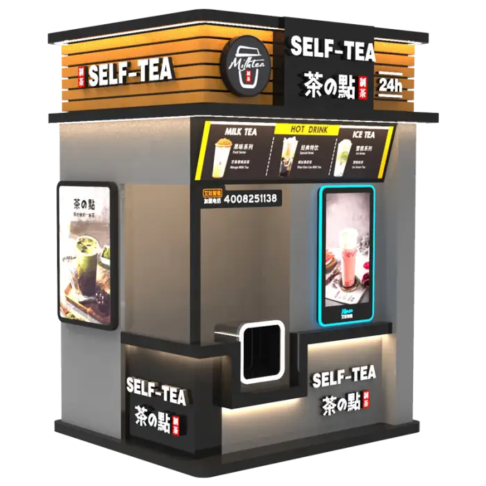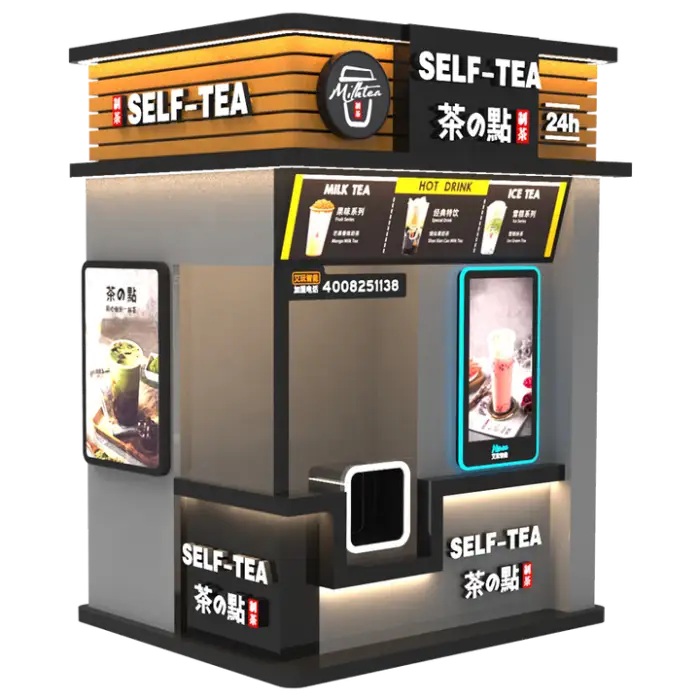 The Bubble Tea Vending Machine can serve a variety of cold drinks including coffee, boba, and milk tea.