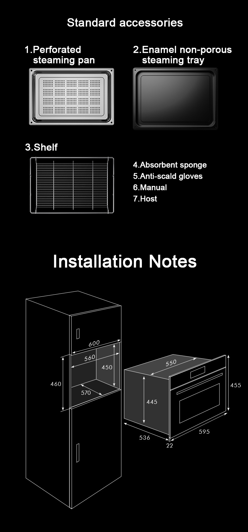 The product dimensions are 595 × 556 × 455 mm. Use these measurements when planning the built-in cabinet or installation space.