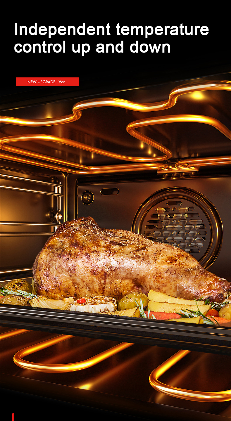 The oven uses an LED touch control interface with a clear display for selecting cooking modes, setting temperature and time, and monitoring progress. Refer to the user manual for detailed instructions on each function.