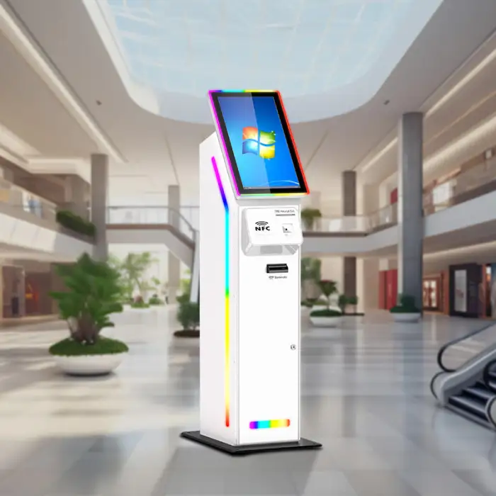 The kiosk features a capacitive touchscreen display, providing an interactive and responsive user experience.