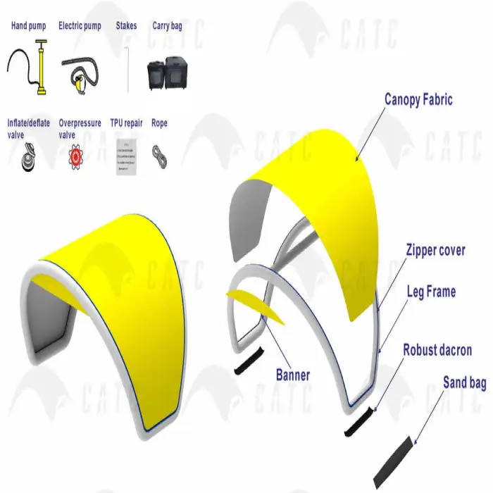 The tent is made from durable Dacron, TPU bladder, and PVC tarpaulin, ensuring longevity and weather resistance.