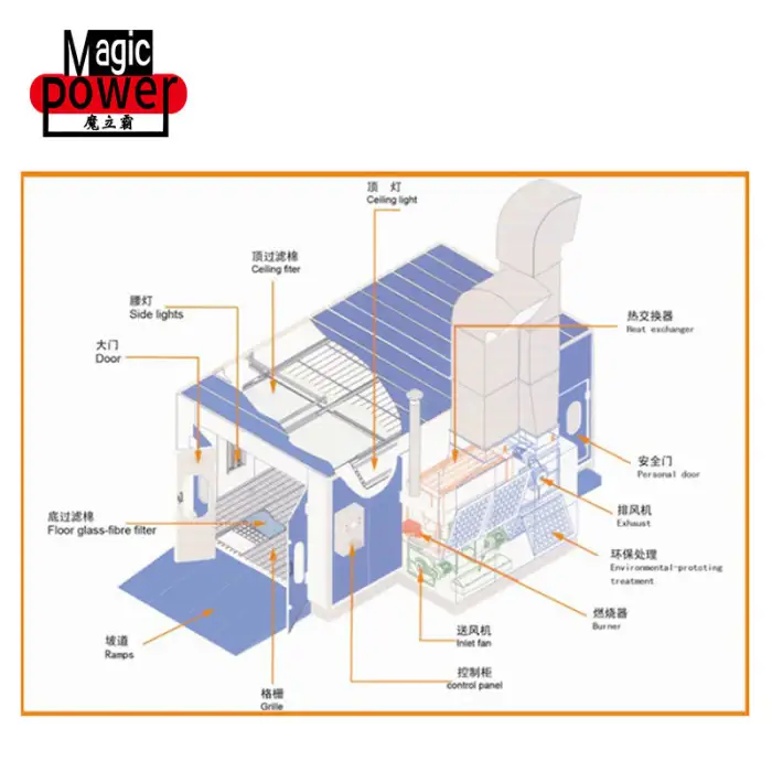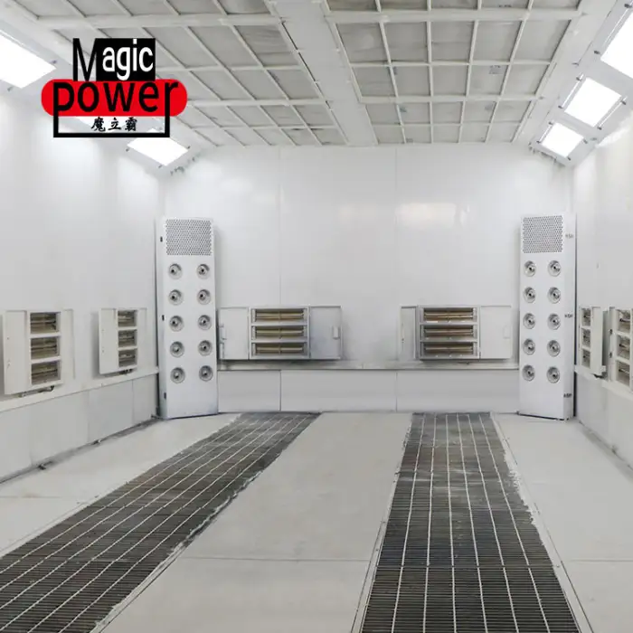 The spray booth utilizes an electric heating system for efficient and quick drying of paint.