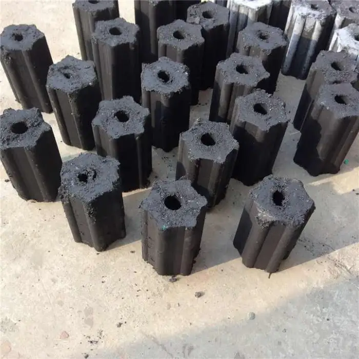 This machine can produce briquettes in various shapes, including hexagon, round, and honeycomb.