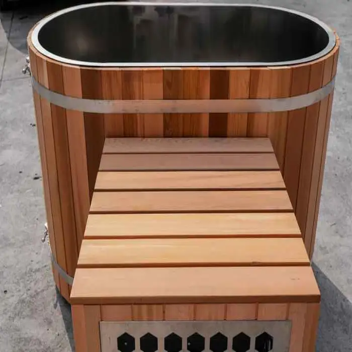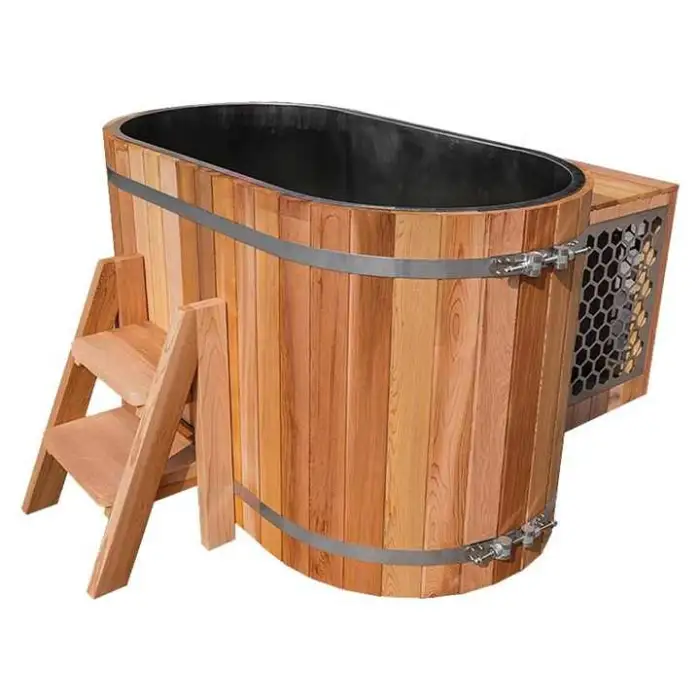The bathtub is made from high-quality cedar wood, known for its durability and natural resistance to moisture.