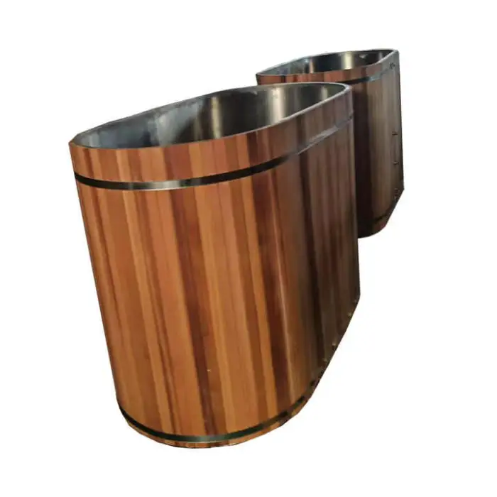 The Cedar Freestanding Wooden Barrel Bath is available in a natural cedar wood color, showcasing its beautiful grain.