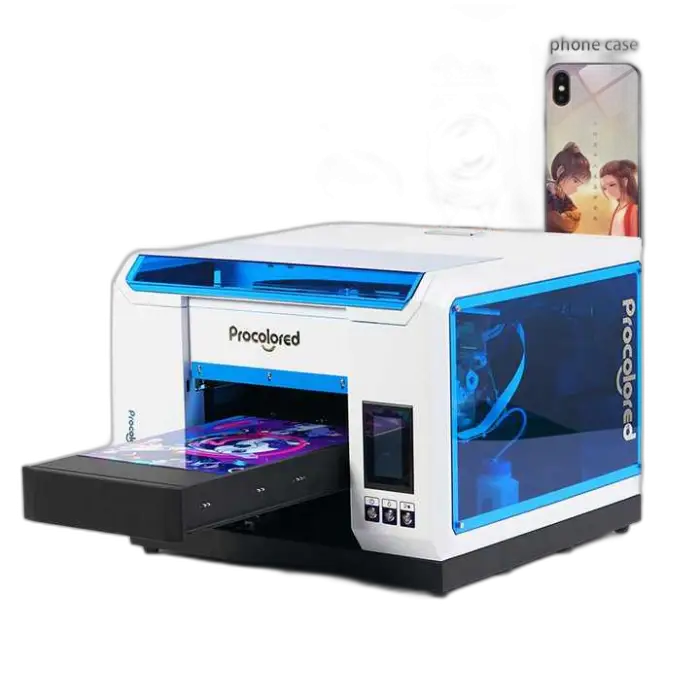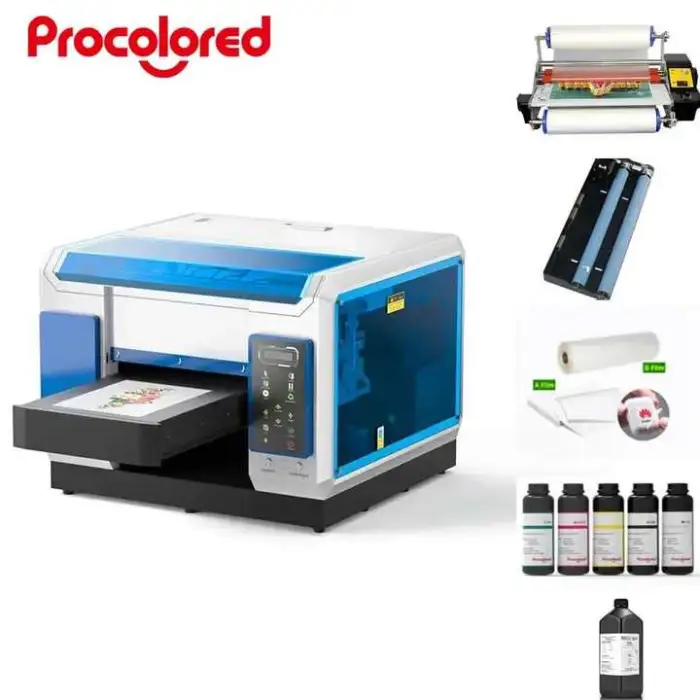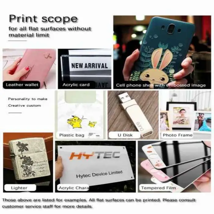 Consumables are generally not included beyond starter ink sets and basic accessories; ongoing costs include replacement UV ink, print heads, cleaning supplies and spare parts. Consumable life and costs vary by usage and print coverage—request a consumables price list from your supplier.