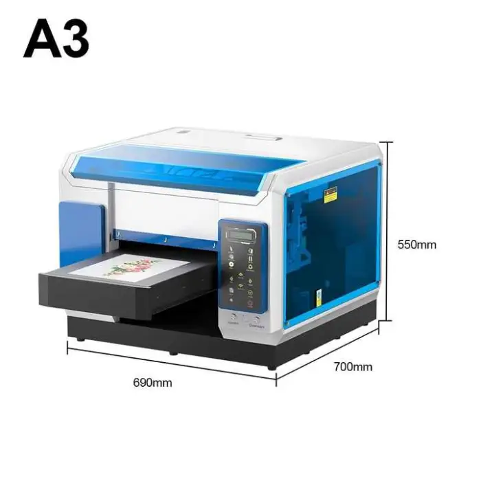 It is an A3-size LED UV flatbed inkjet printer designed for high-resolution (720 x 1440 dpi) multicolor printing on a variety of substrates such as phone cases, wood, plywood, acrylic and similar flat items. Model: A3 PRO-1390 (print head R1390 / TX800).
