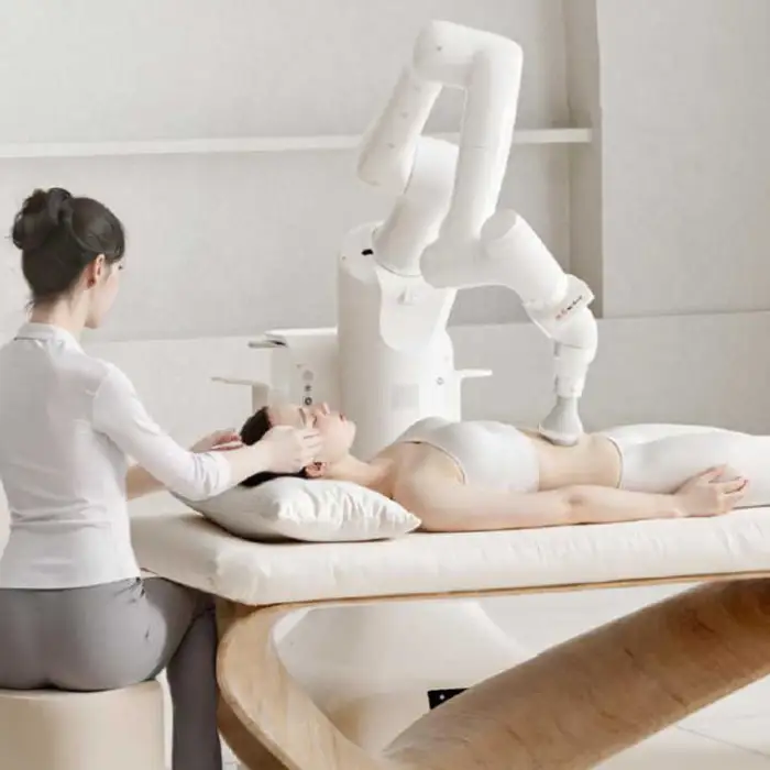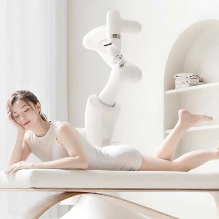It is an automatic massage and physiotherapy device with a robot arm and changeable heads designed to provide targeted massage, rehabilitation and facial treatments for home and commercial use. It uses AI to personalize massage patterns and is CE certified.