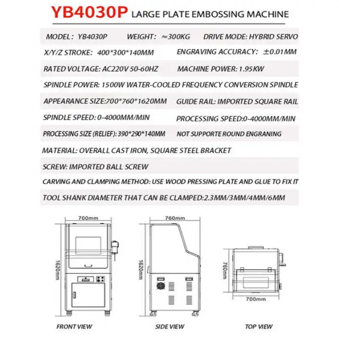 The CHENYISHI Large Embossing Machine YB4030P is designed to work with wood, stone, and soft metals, making it versatile for various artistic projects.