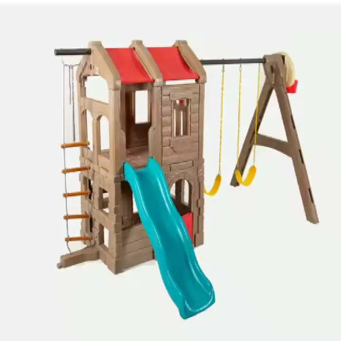 The Children Toy Plastic Play House is made from safe materials including PE, Plastic, LLDPE, and Steel.