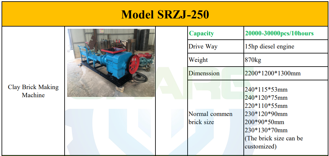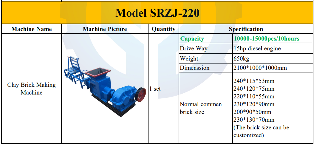 It can make solid clay bricks, red clay bricks, red soil standard bricks and red mud bricks. With different molds it can also produce various sizes and shapes; hollow molds are available but require higher soil viscosity.