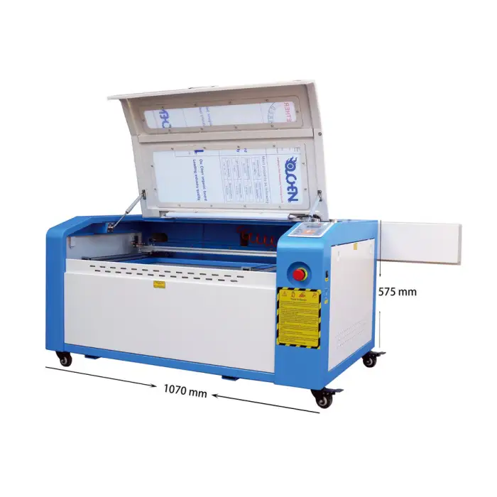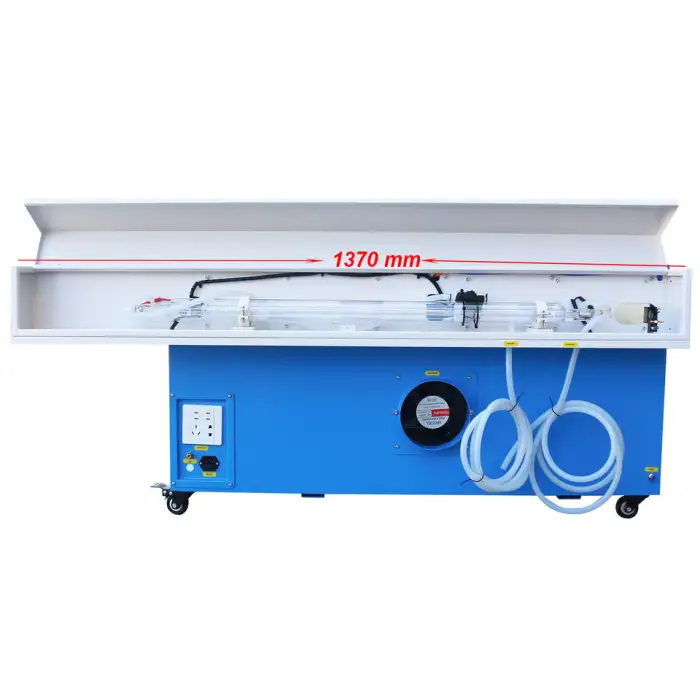 The machine uses a water cooling system to maintain optimal operating temperatures during engraving and cutting tasks.