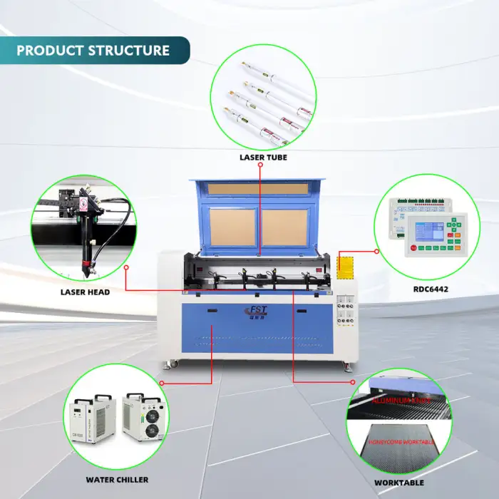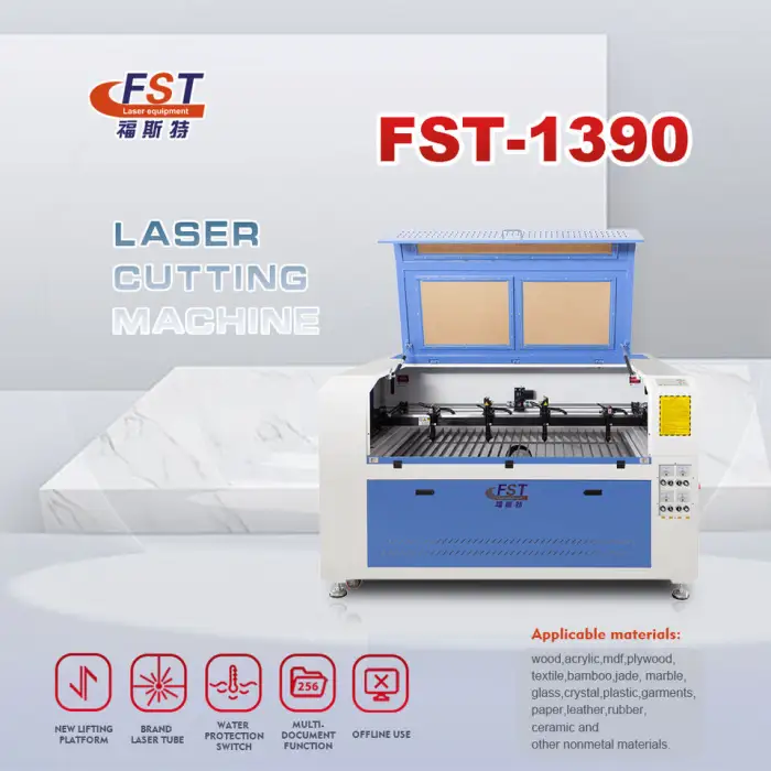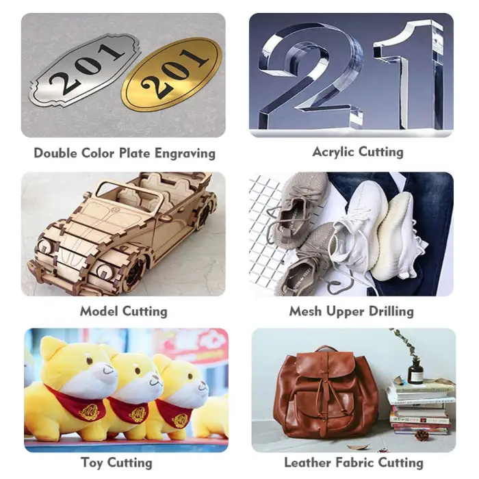 The machine can cut and engrave various materials such as wood, glass, and acrylic.