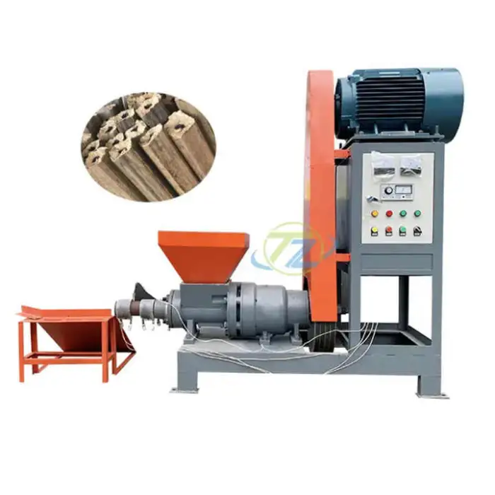 The machine compresses biomass materials into briquettes using a robust motor, facilitating the conversion of waste into valuable fuel.