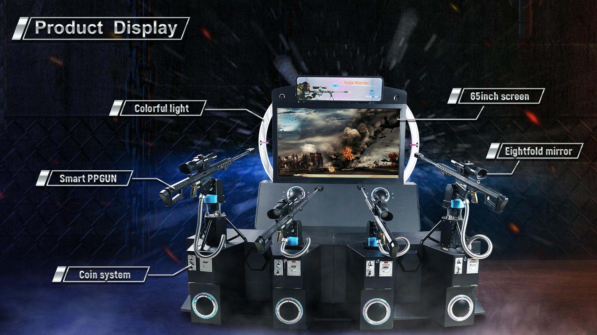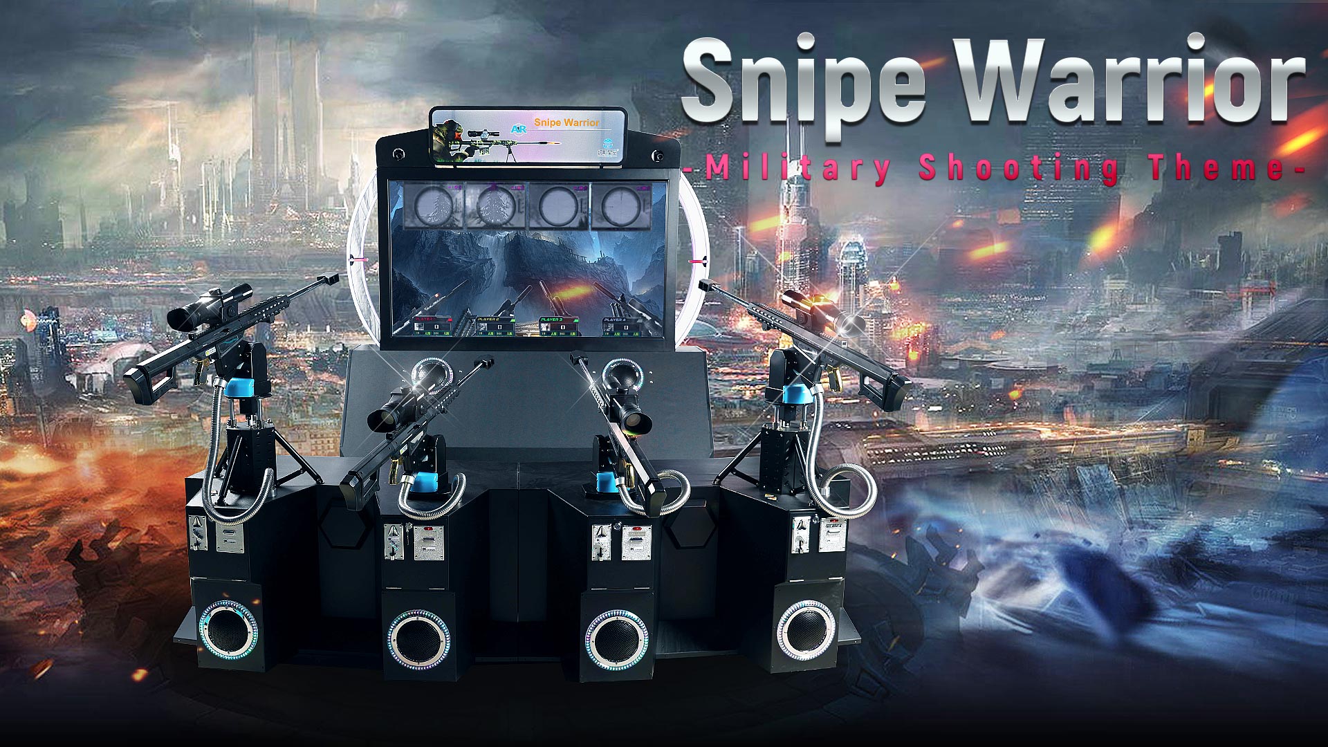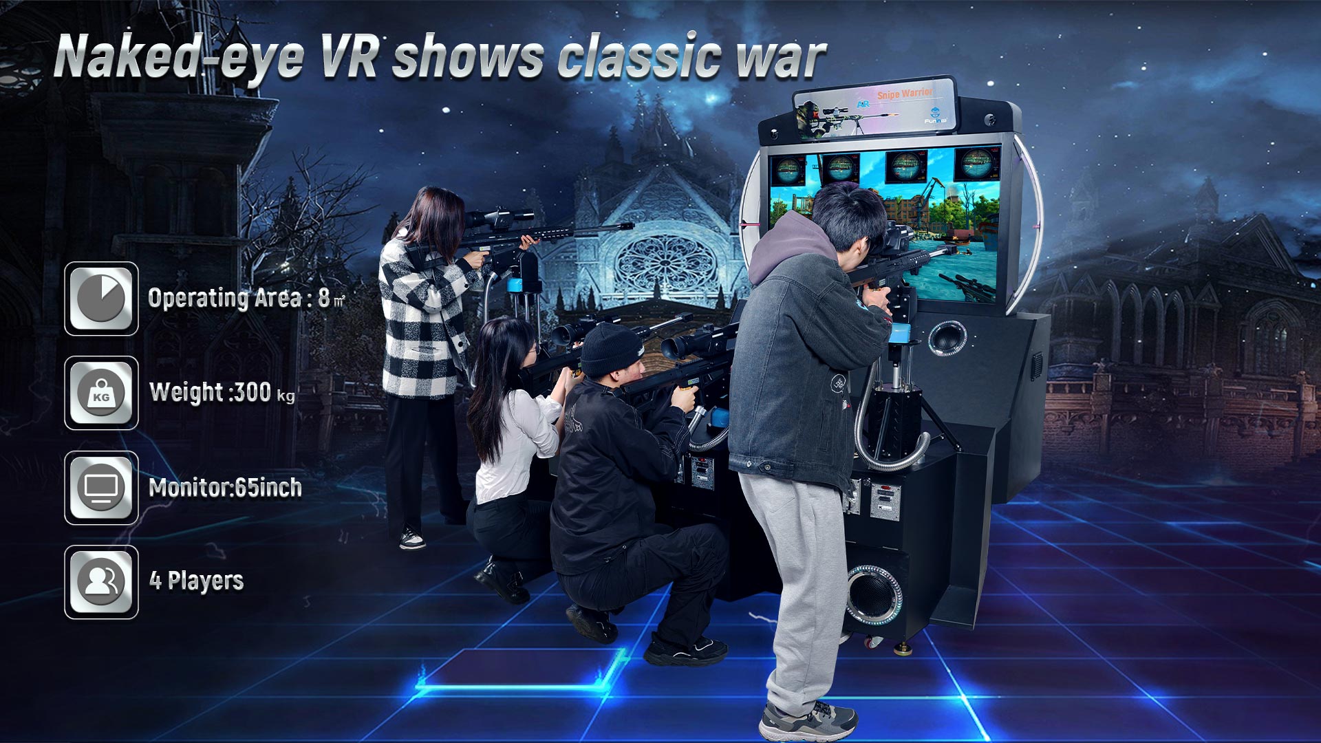The Coin Operated Shooting Zombies Arcade Game, also known as Snipe Warrior, is an augmented reality (AR) team shooting game where players work together to eliminate zombies in an immersive gaming experience.