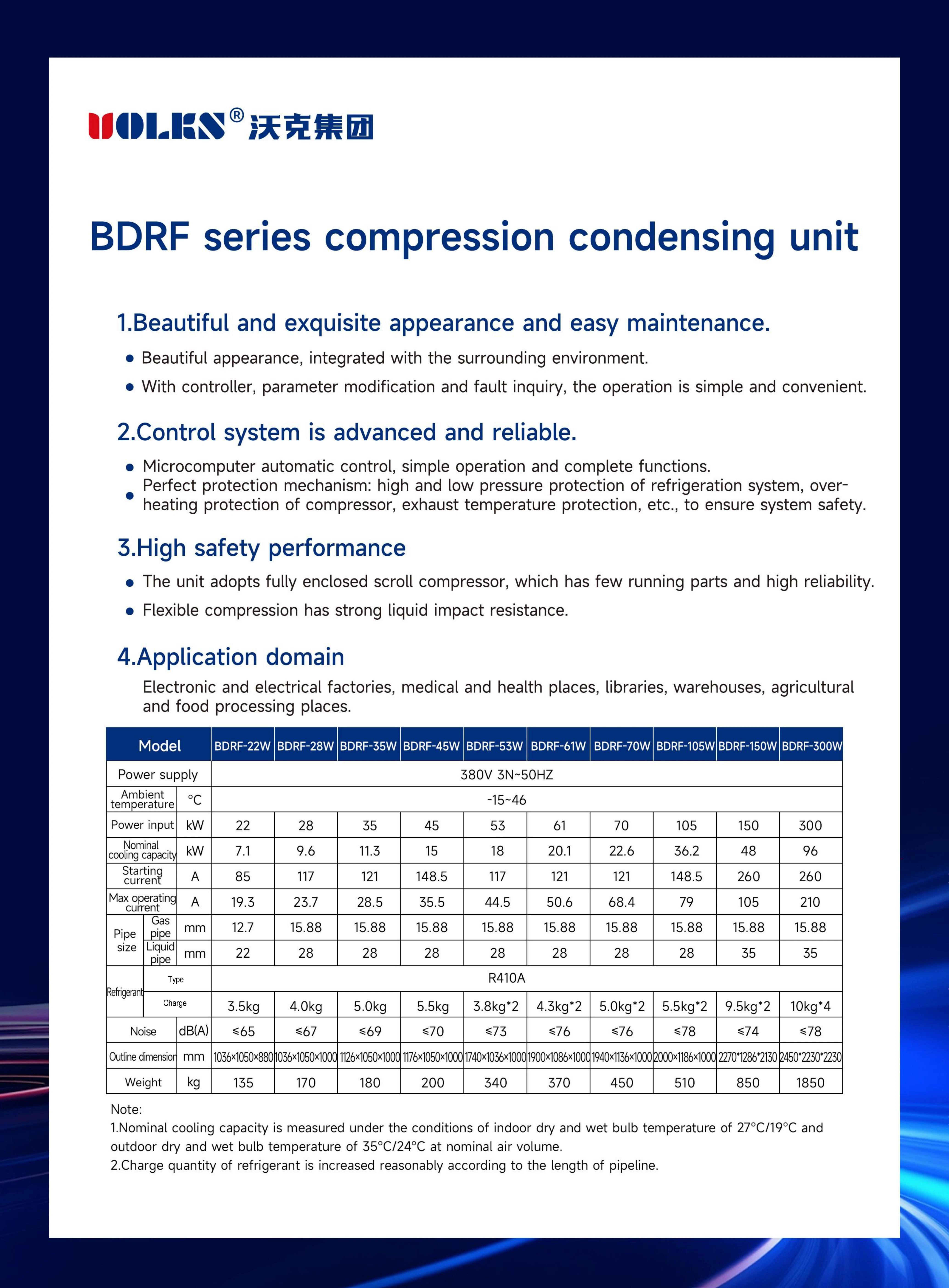 The cooling capacity of the unit ranges from 7.1KW to 96KW, making it suitable for various cold storage needs.