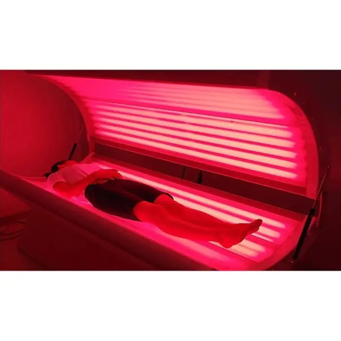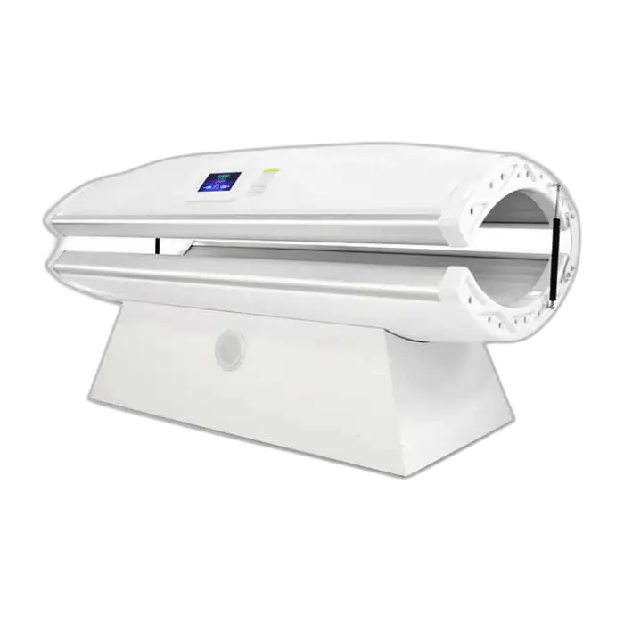 The unit combines tanning lamps with light-based skin-care modalities (collagen-focused light therapy) to deliver both tanning and complementary skin treatments. For technical details about wavelengths and lamp types, consult the product manual or contact the manufacturer.