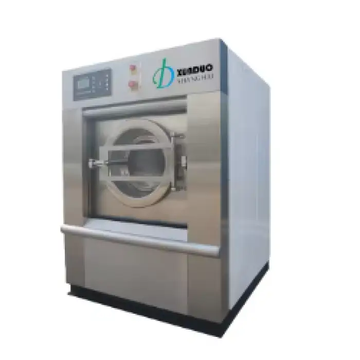 The machine is suitable for washing large amounts of clothing, linens, and various other fabrics.