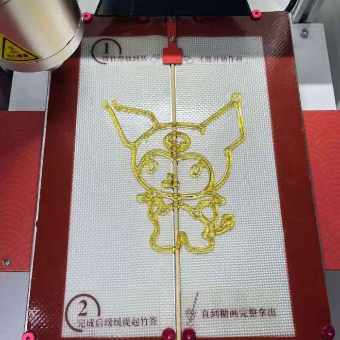 The machine is designed for high efficiency and quick service, allowing users to receive their custom candy designs in a short amount of time.