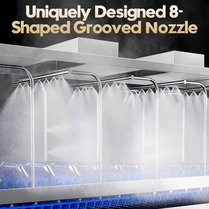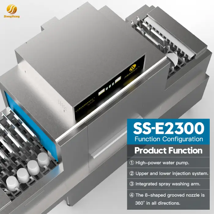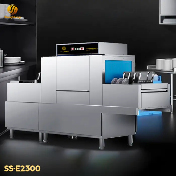 The dishwasher features automatic operation with a belt conveyor system, simplifying the dishwashing process and increasing efficiency.