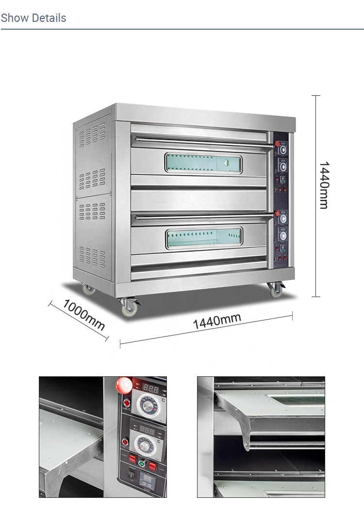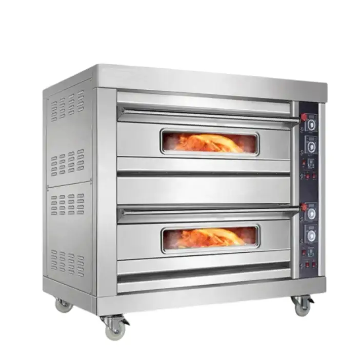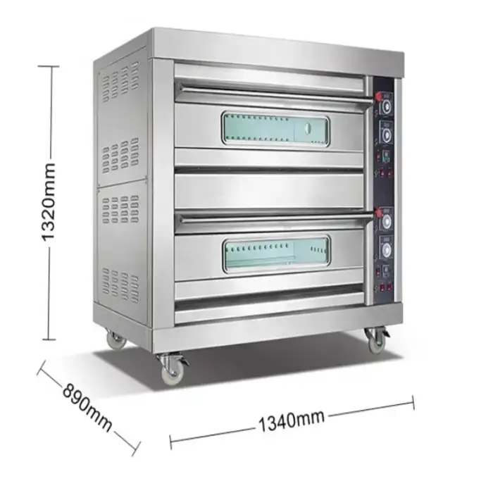 This commercial gas oven has two decks and four tray positions, stainless steel construction, accurate temperature control, a mechanical timer, and uses 220V electrical supply for controls/ignition. It is designed for high-volume baking in restaurants, bakeries, and catering operations.