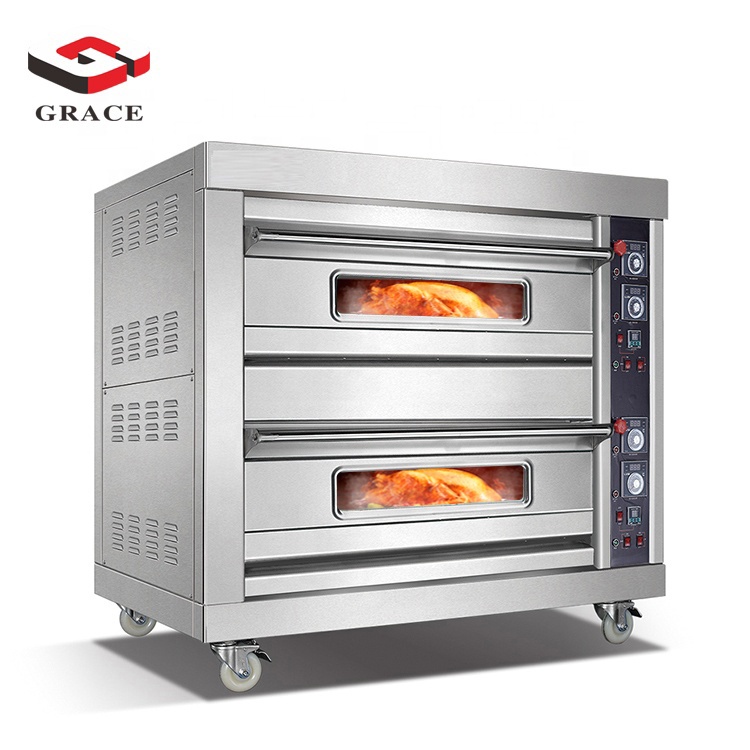 Yes — the oven is designed for pizza and general baking. The product name references a stone (pizza stone) and the two-deck, four-tray layout supports high-volume pizza production. Confirm stone inclusion and deck temperature capability with the supplier for pizza-specific needs.