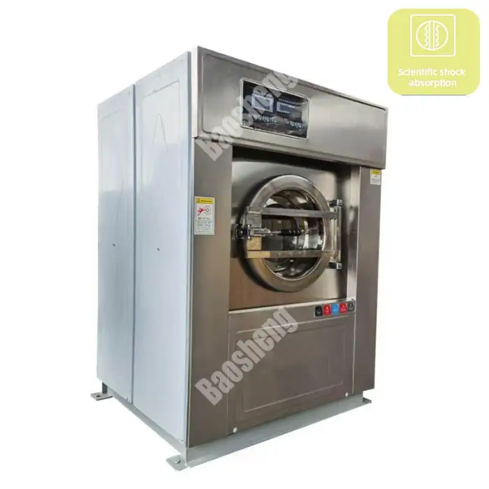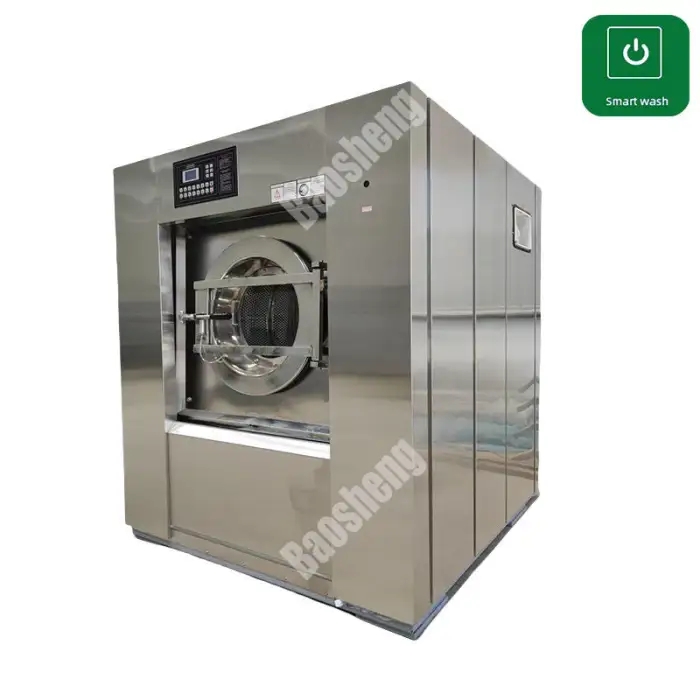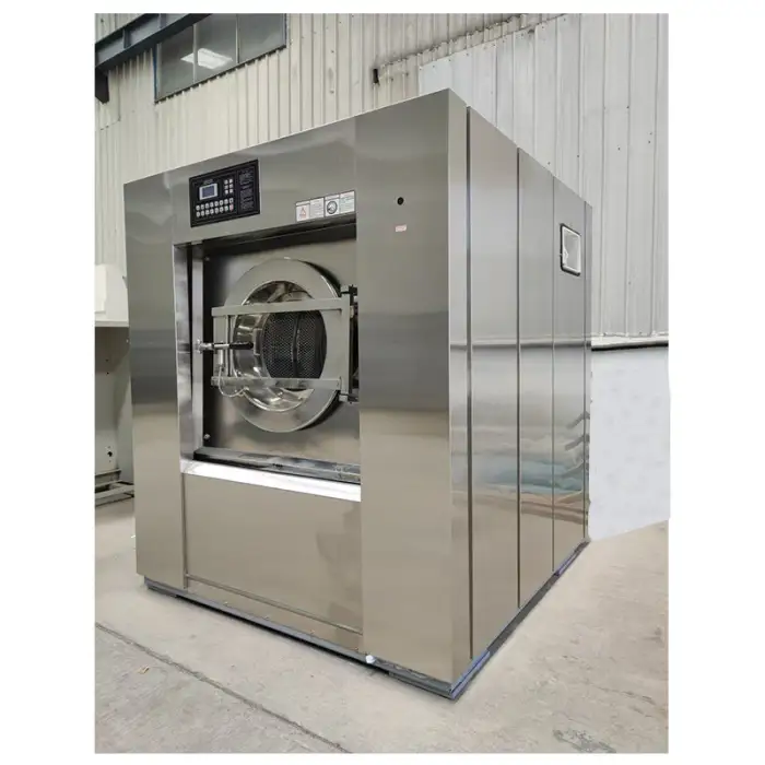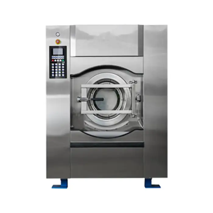 The machine has a capacity range of 15kg to 100kg, making it suitable for various laundry loads.