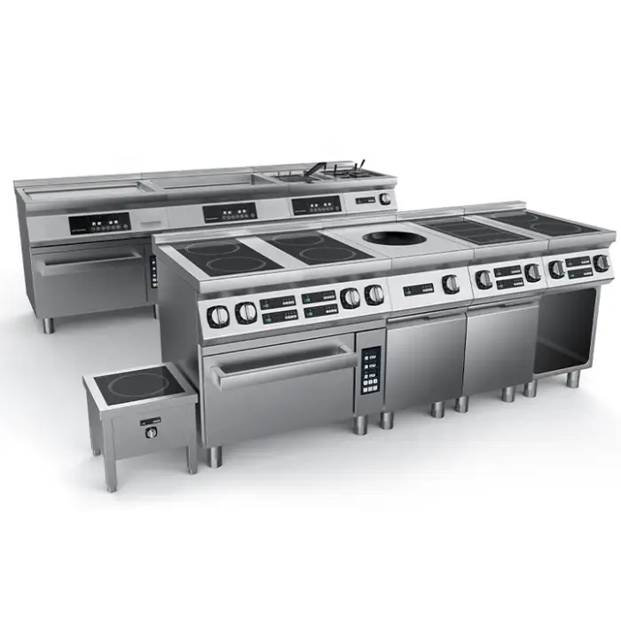 The cooking range is designed for commercial applications including restaurants, schools, hotels, and catering services.