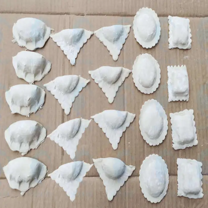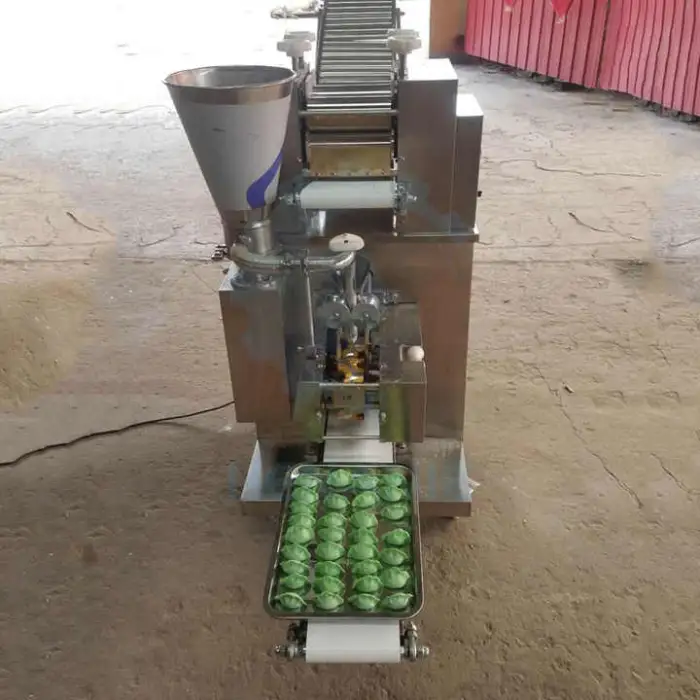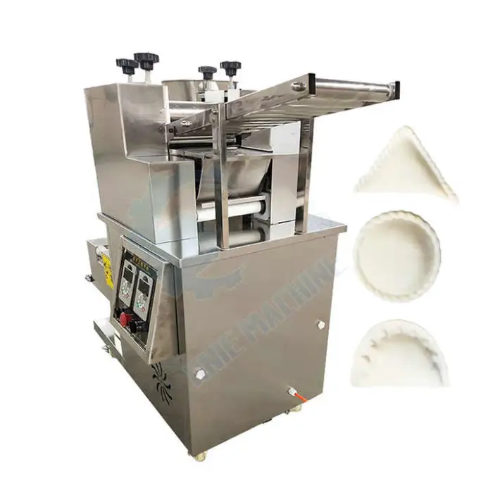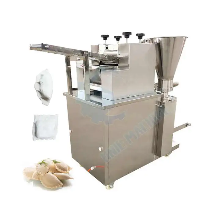 The machine handles a variety of doughs and fillings (meat, vegetables, cheese, etc.). Optimal results depend on dough formulation and filling consistency; you may need to adjust dough thickness and machine settings for best sealing and appearance.