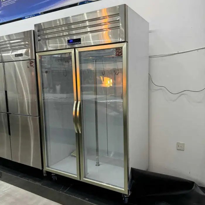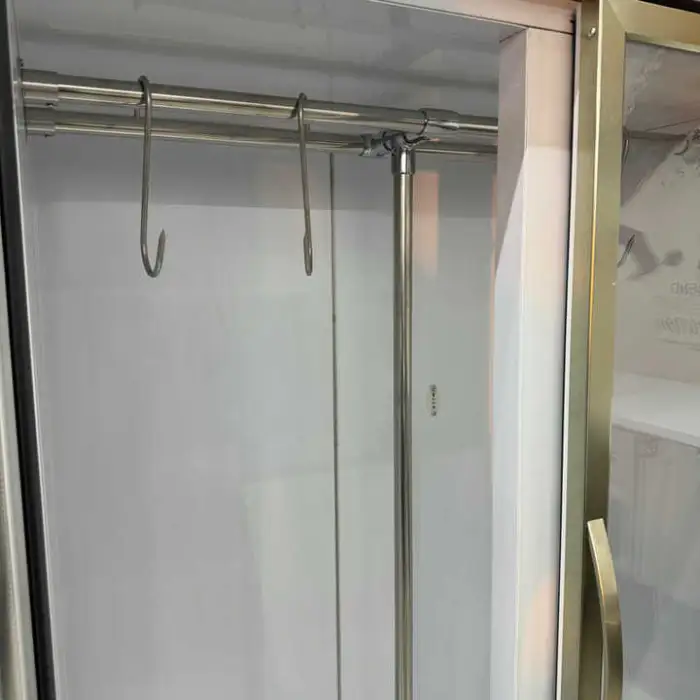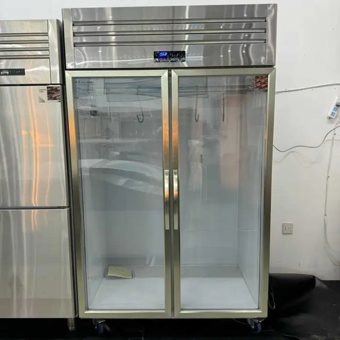 Meat hanging refrigerators are fitted or configured to support hanging rails or hooks for carcasses and cuts. Hooks/rails are often available as standard or optional accessories — confirm with the supplier which accessories are included or available as add-ons.