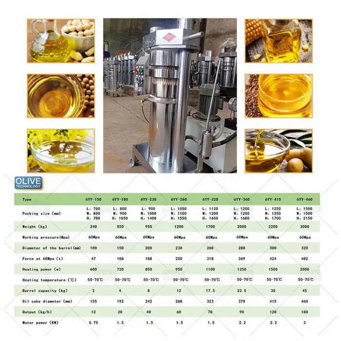 The Commercial Oil Press Machine is capable of extracting various oils including olive oil, hemp oil, flax seed oil, soybean oil, sesame oil, pinenut oil, sunflower oil, almond oil, and peanut oil.