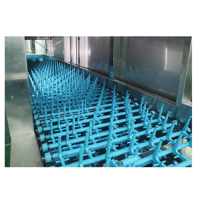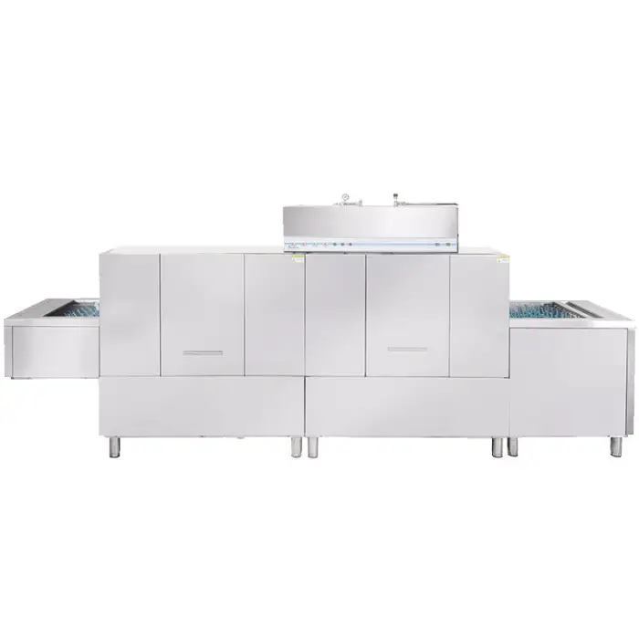 The conveyor system allows dishes to be loaded at one end and automatically progresses through the cleaning and drying stages, enhancing efficiency in busy kitchens.