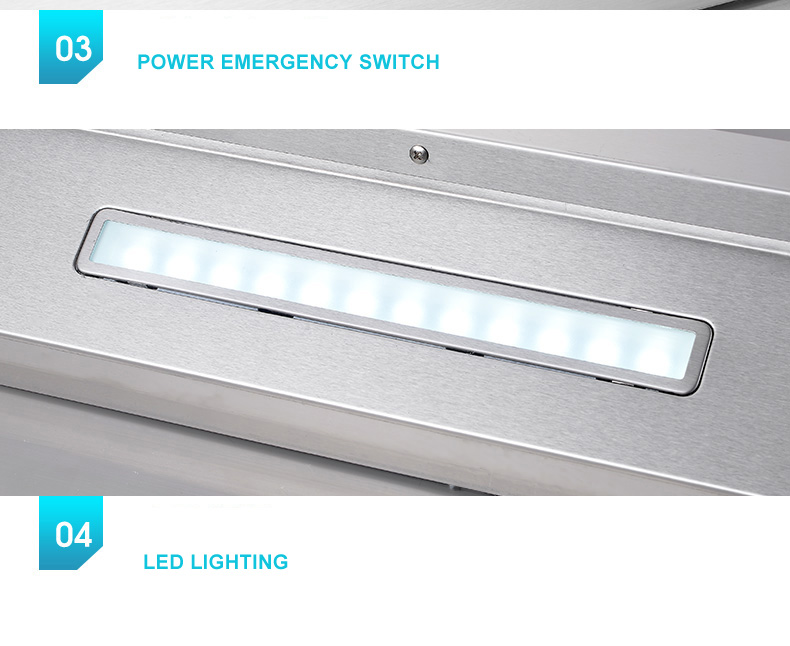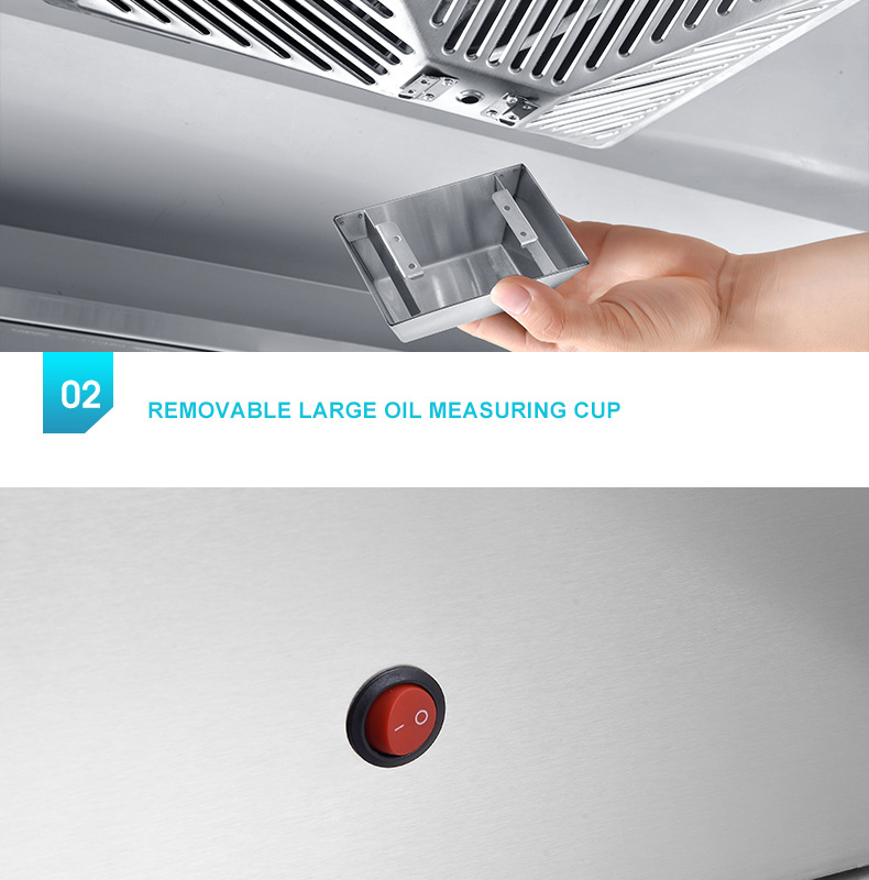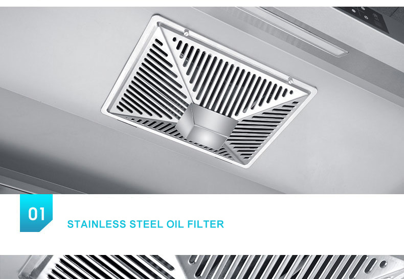 The housing and chimney are stainless steel for durability and a modern look. Grease is captured by washable aluminum filters.