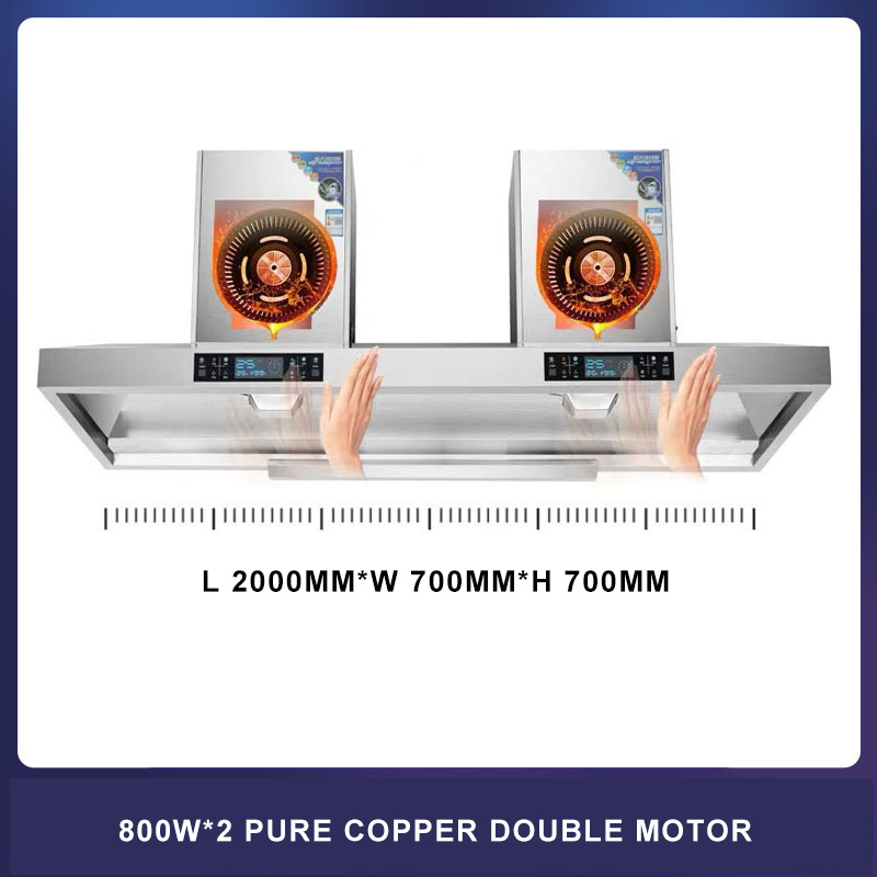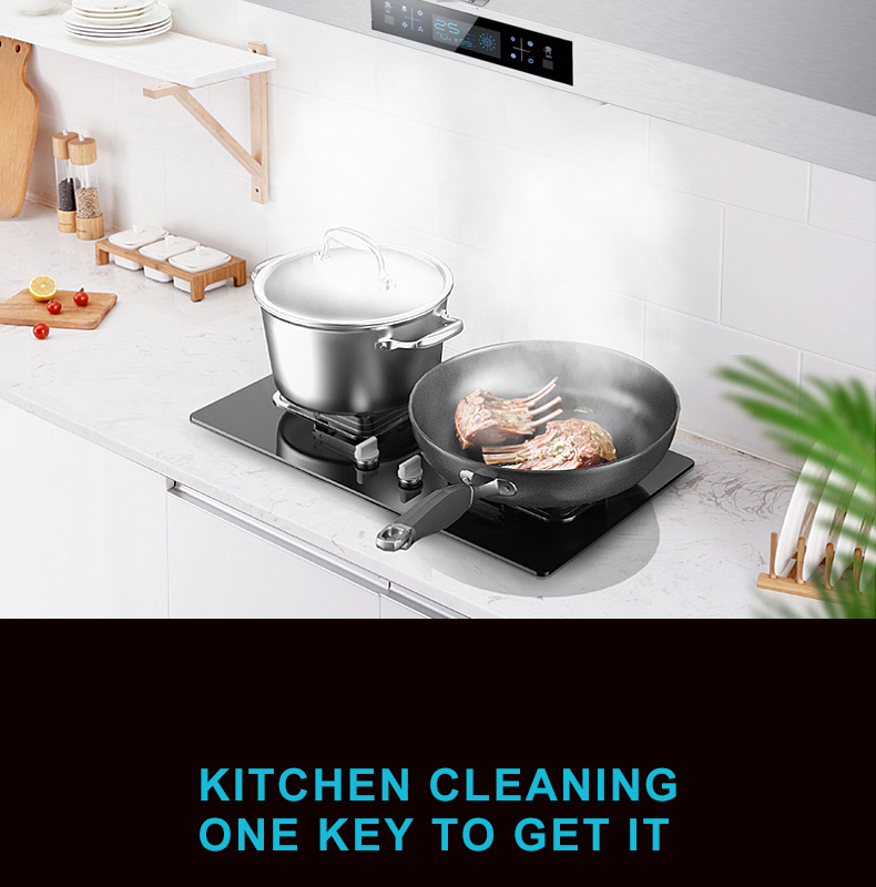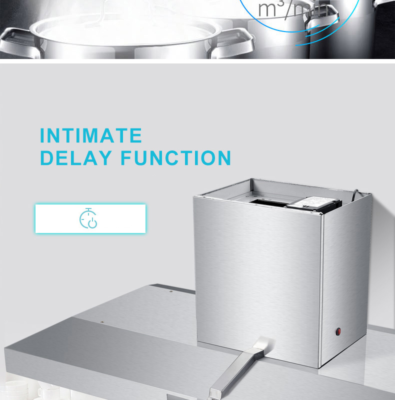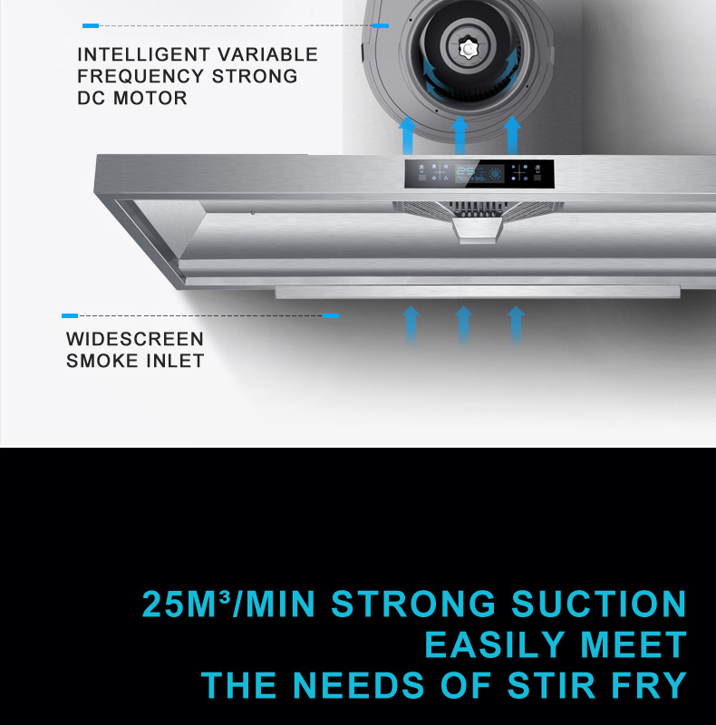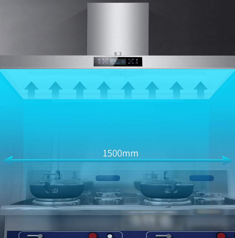 The range hood provides a high airflow of approximately 15–17 m³/min, designed to quickly remove smoke, grease and cooking odors.