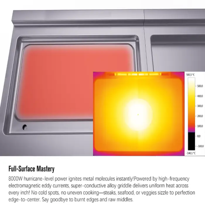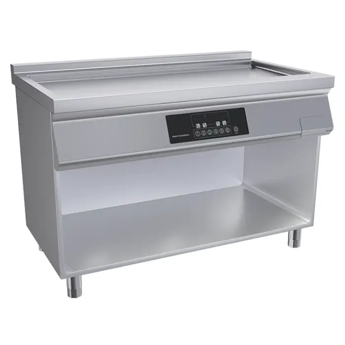 A heavy-duty, freestanding induction flat top griddle made of stainless steel for commercial kitchens. It combines induction heating with a non-stick cooking surface for grilling, frying and general high-volume cooking in hotels, restaurants, catering and similar operations.
