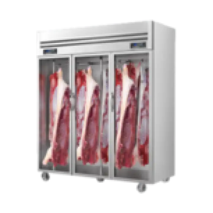 A vertical hanging meat display freezer designed for shops and restaurants to showcase and preserve meat products while keeping them visible and easily accessible.
