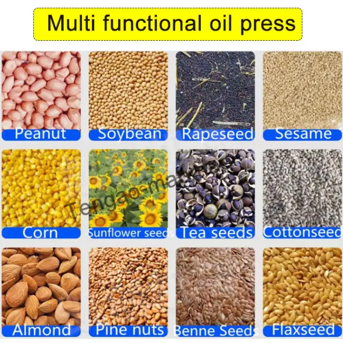 The machine is designed to extract oils from various seeds and nuts, including sunflower, olive, coconut, and groundnut (peanut).
