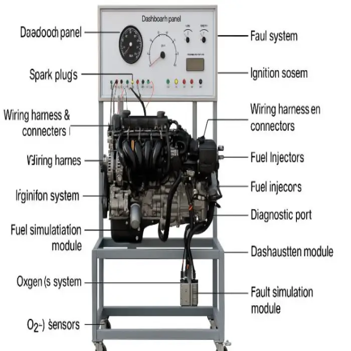 The built-in fault simulation system can introduce common engine failures via switches or an optional intelligent fault setting module, enabling students to practice diagnosis and repair procedures.