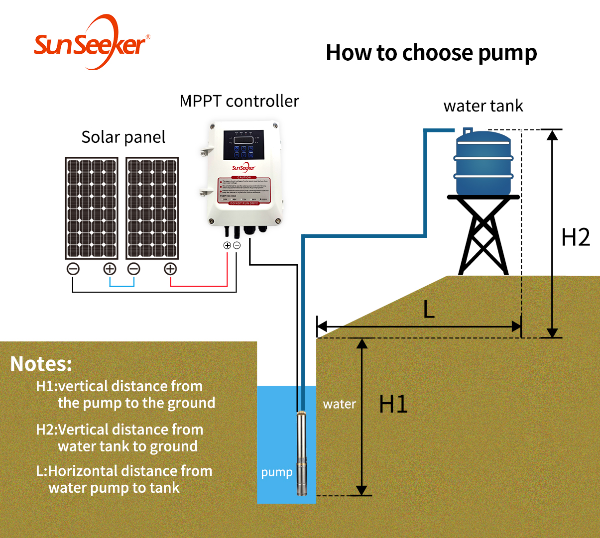 Estimate your daily water requirement (m3/day). Divide by estimated working hours (use 5 hours/day for solar pumps) to get required flow (m3/h). Example: 2.5 m3/day ÷ 5 h = 0.5 m3/h. Choose a pump whose actual flow at your calculated total head meets or exceeds that value.