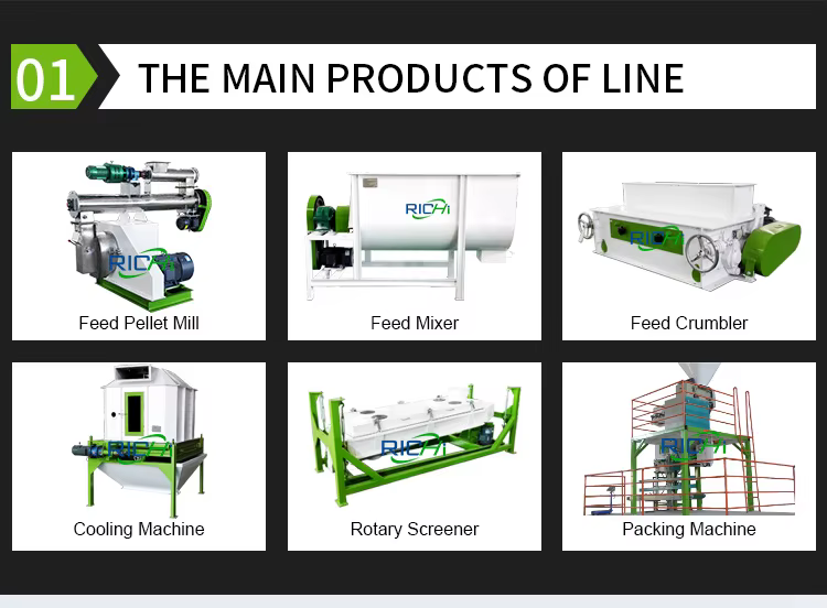 The production line includes a hammer mill, feed mixer, pellet machine, cooling machine, vibrating screener, and packing machine.