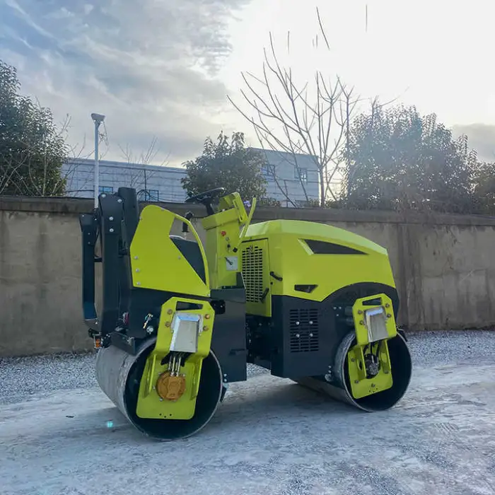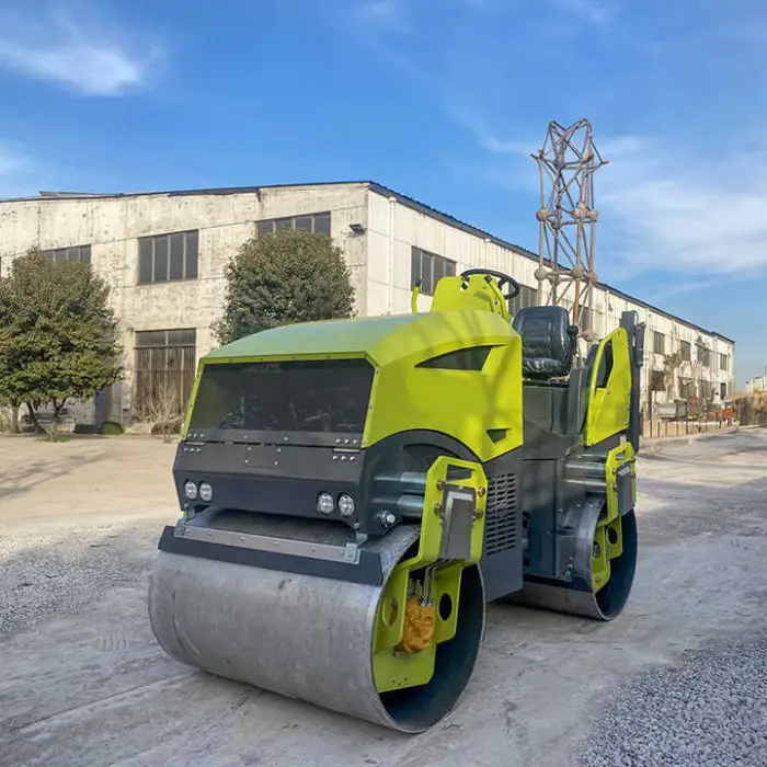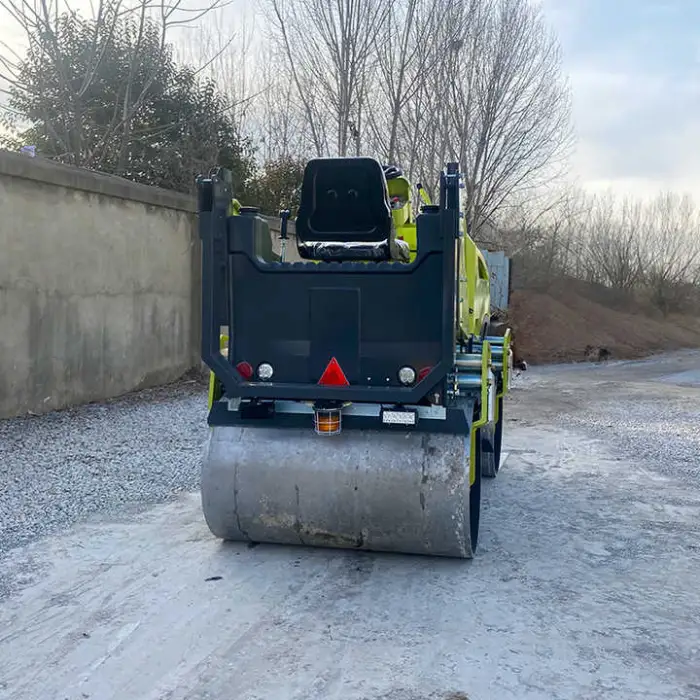 The road roller is equipped with a hydraulic steering system for smooth control.
