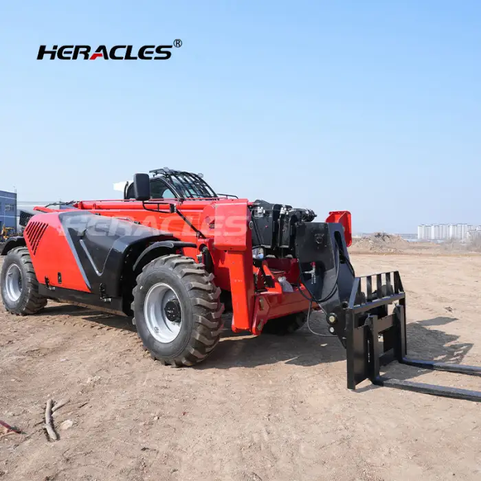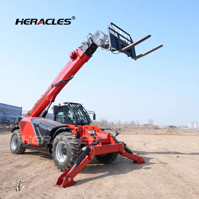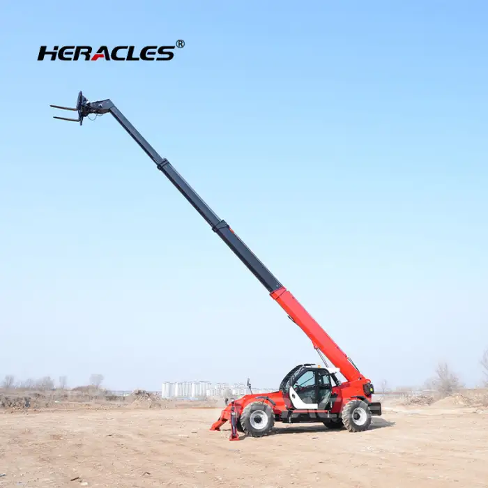 The telehandler features a sturdy design that makes it suitable for various terrains.