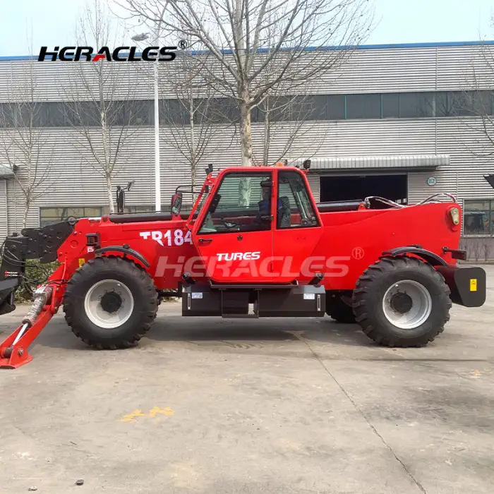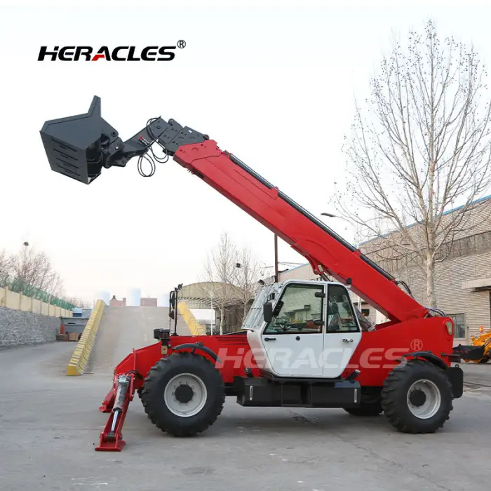 The telehandler supports multi-functional operation with replaceable attachments, allowing it to handle a variety of tasks.