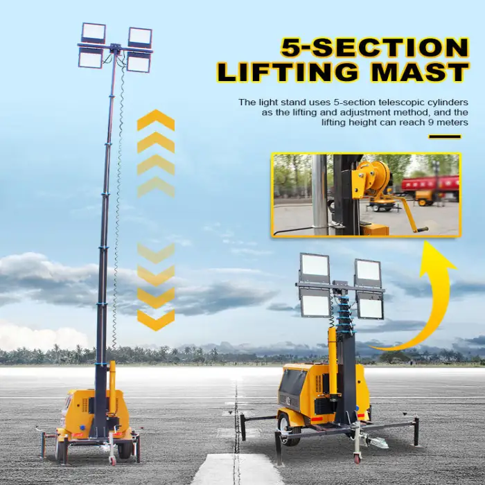 The lighting tower is suitable for construction sites, outdoor events, emergency operations, roadworks, and remote locations needing temporary lighting.