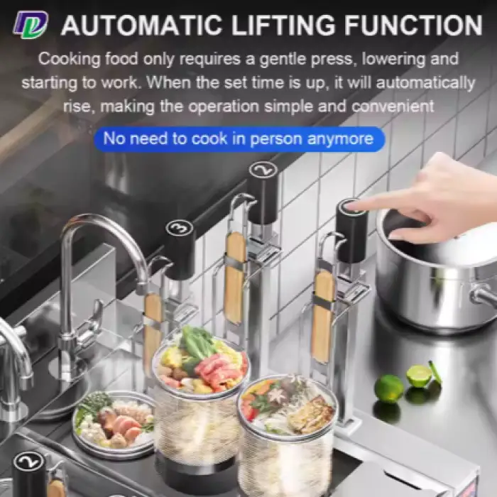The automatic lift-up mechanism raises and lowers the cooking basket on a timer or program, ensuring consistent cook times, reducing the need for manual handling, and helping prevent overcooking and operator exposure to boiling water.