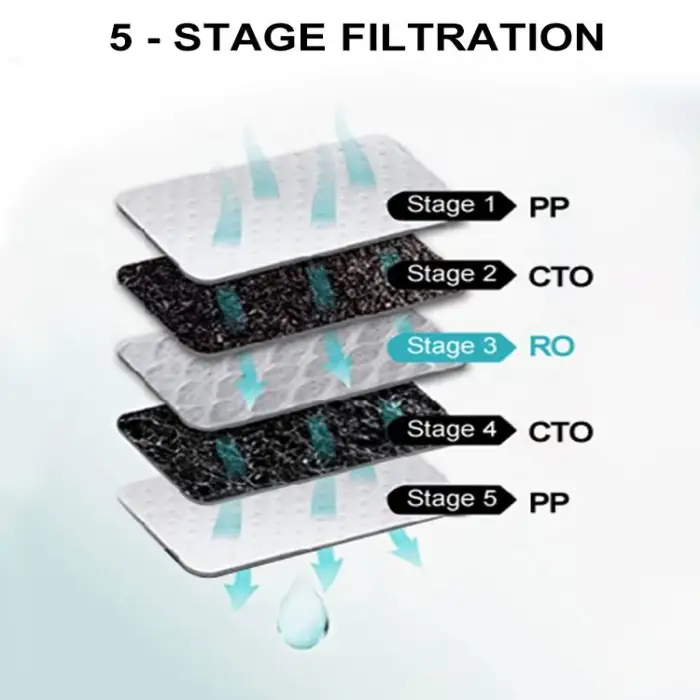 The filtration system includes PP, CTO, RO, CTO, and Post Carbon filter cartridges.